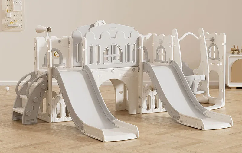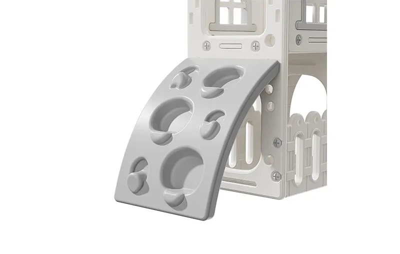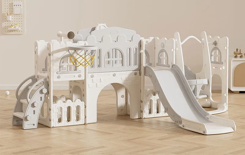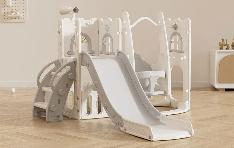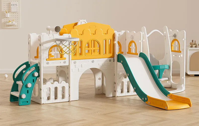007 Combine Slide For Baby is a multi - functional plastic swing and slide set. It has a small plastic slide, along with diverse play areas like a basketball hoop, climbing parts, and a swing. With adjustable height, features such as an interactive driving cabin and a rotatable telescope. Age: Age 1+ Slide Width: 38 cm Equipment length: 253 cm Device Width: 165 cm