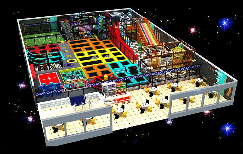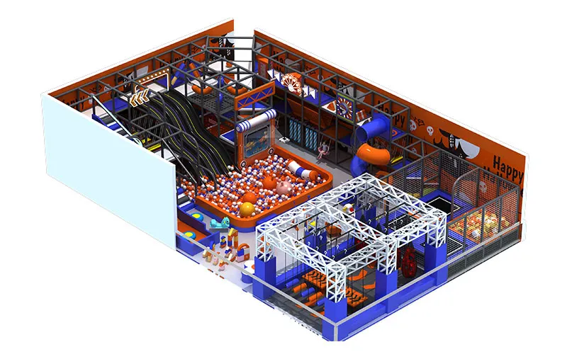 Vertical Integration: Utilize vertical space through multi-level climbing structures or suspended play elements. For example, a "treehouse" theme with elevated platforms connected by bridges maximizes floor space while creating visual interest.