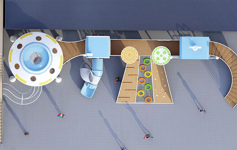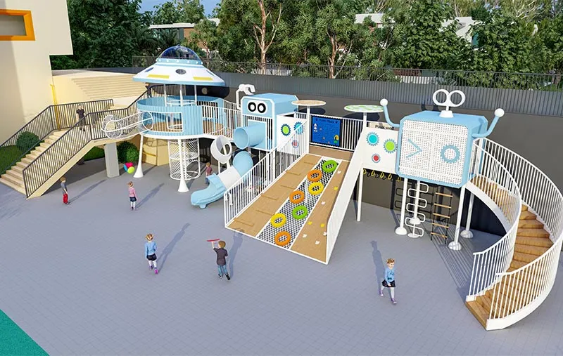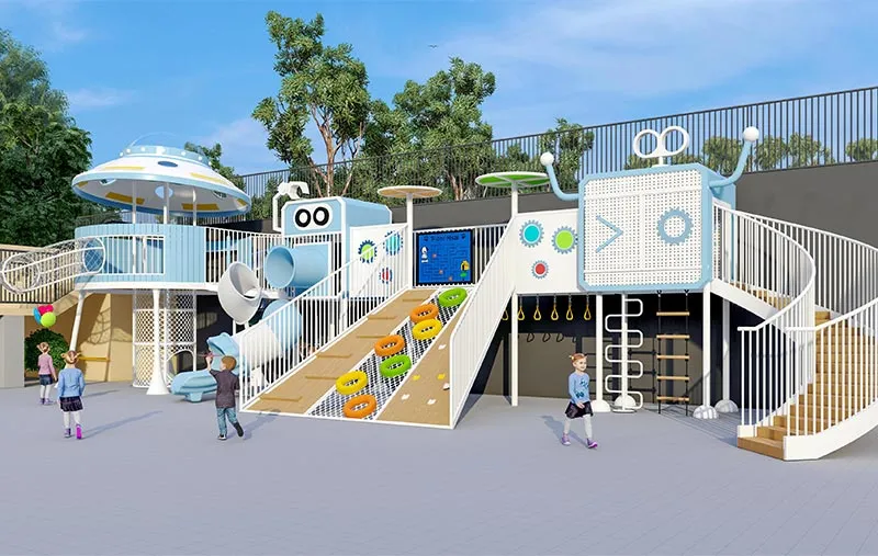 Where futuristic fun meets childhood imagination! Our UFO-themed playset in striking white-blue combo becomes the kindergarten's most eye-catching "happy planet". Mega climbing structures test little astronauts' bravery, spiral staircases connect fantasy zones, 3D net climbers boost coordination, and tunnel tubes spark exploration—all built with galvanized steel frames + natural wood elements for safe adventures.