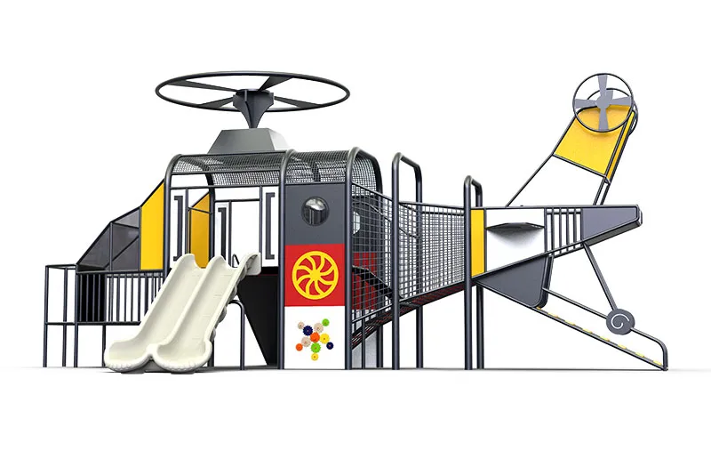 A. Plastic parts: Imported LLDPE B. Post: National standard galvanized steel pipe C.Metals: Galvanized steel D. Deck, stair, bridge: Steel with plastic covered (Different material is available at your demand) |